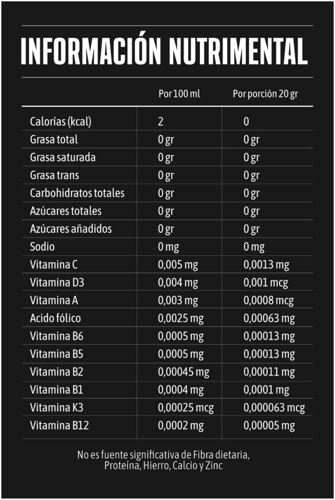 No superar la dosis recomendada. No consumir durante el embarazo y la lactancia. Mantener fuera del alcance de los niños. El consumo de este producto es responsabilidad de quien lo recomienda y de quien lo usa. Consultar a un médico antes de usarlo. Este producto no es un medicamento. Contiene cafeína. No recomendable en niños. No apto para menores de 18 años. No consumir si padece de enfermedades cardíacas o hipertensión sin consultar a su médico. Una vez abierto consumir en el menor tiempo posible.